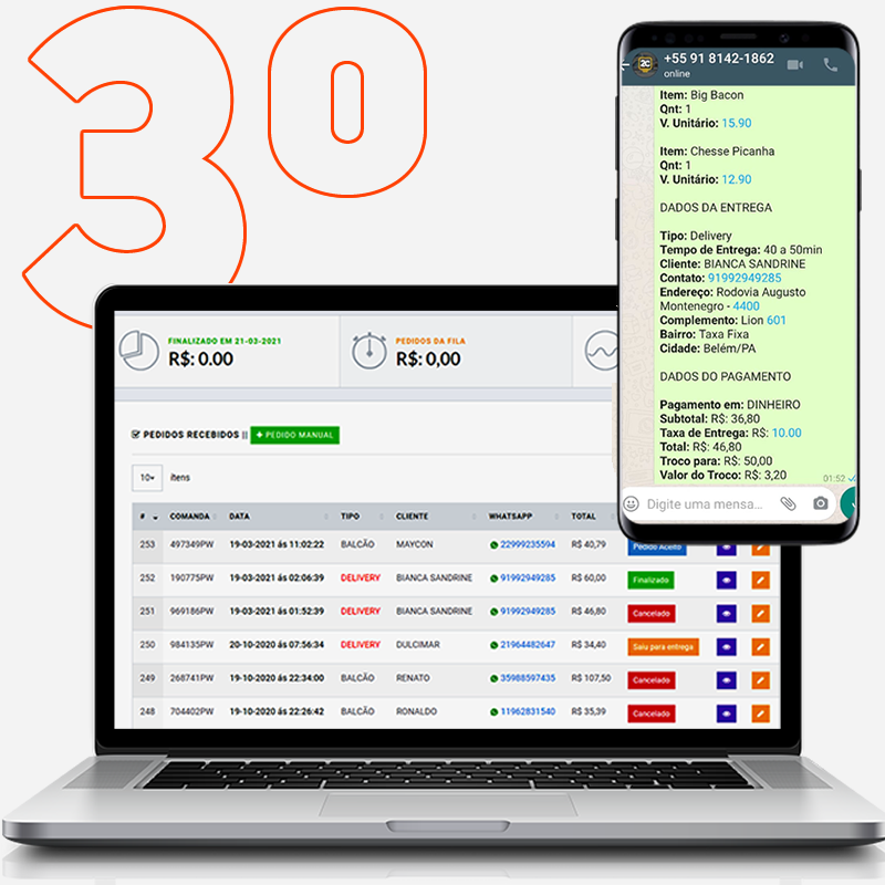 Receba os pedidos no seu Whatsapp e PDV.